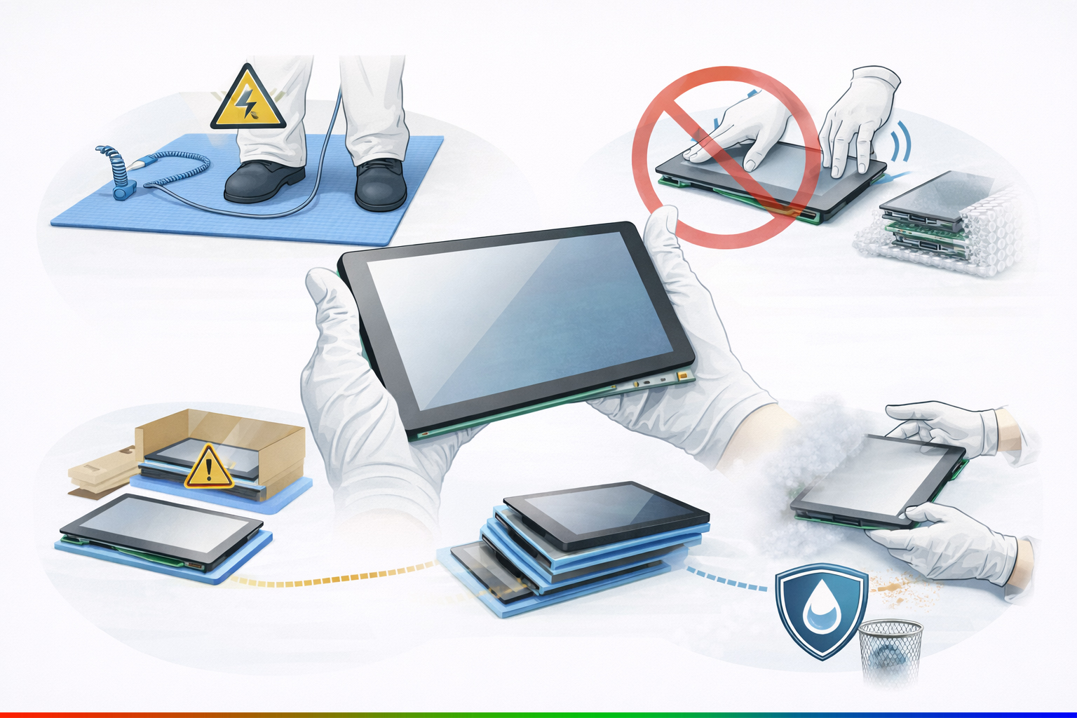 Moderne Displays (TFT, OLED, Touch) sind empfindliche elektronische Bauteile. Schäden entstehen nicht nur durch elektrostatische Entladung (ESD), sondern auch durch unsachgemässe Handhabung – z. B. Druck, Schmutz oder Feuchtigkeit. Dieses Whitepaper fasst die wichtigsten Schutzmaßnahmen zusammen.